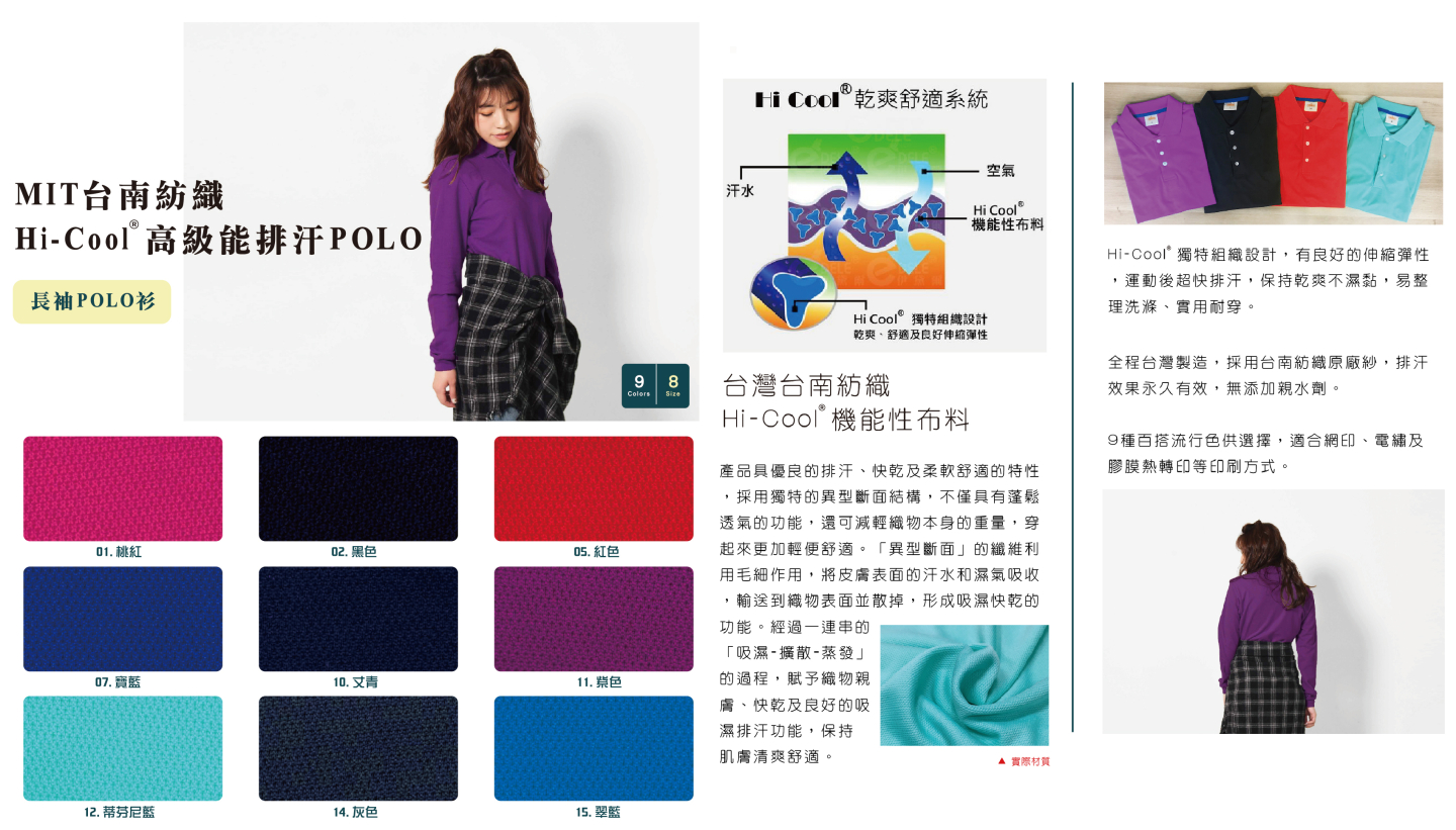 - 材質100% PolyesterHi-Cool產品具優良的排汗、快乾及柔軟舒適的特性